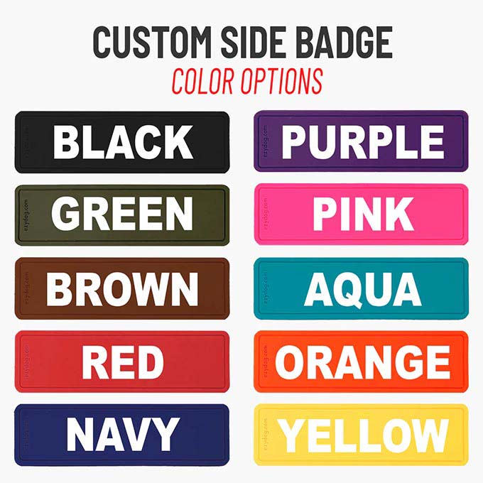 Add custom side badges to personalize your Tripawd Convert harness! Create your own service dog harness with a custom message, or add a name to personalize your Tripawd Convert harness.